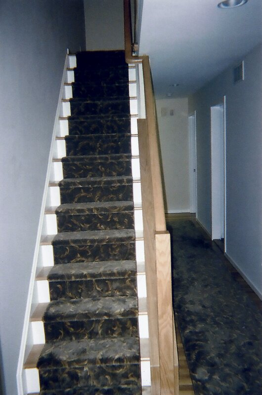 Interior view from the bottom of the new stairs going up to the added second story.